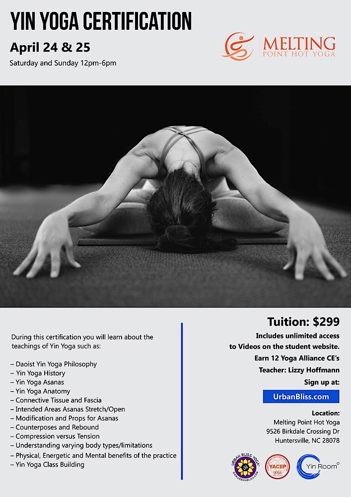 Join us for a 2 day Yin Yoga Certification in Huntersville led by Lizzy Hoffmann, Director of Urban Bliss Yoga. During this training you will learn all about the teachings of Yin Yoga as well as: